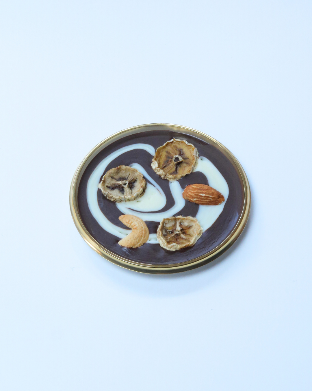 原材料名:チョコレートコーチング(乳成分を含む)(ベルギー製造)、バナナ(フィリピン産)、アーモンド、カシューナッツ、油脂加工食品(乳成分を含む)(ベルギー製造)/レシチン(大豆を含む)、香料